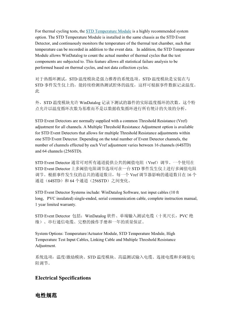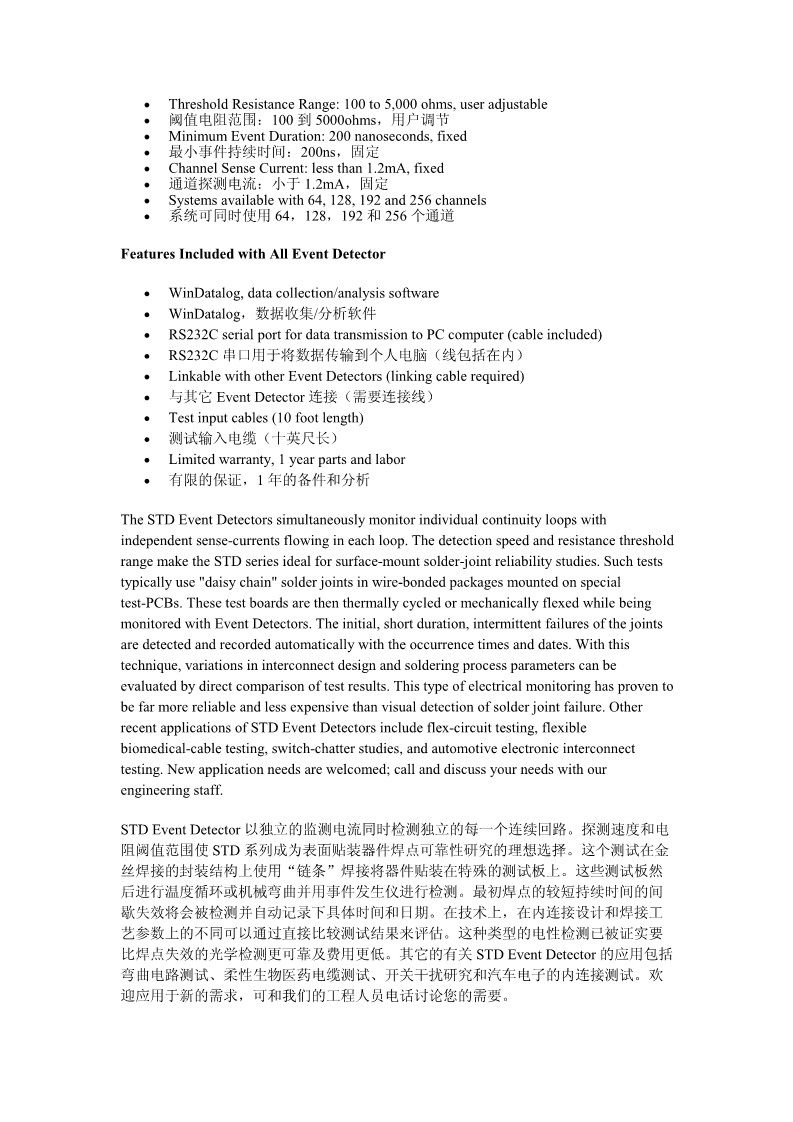 STD系列Event Detector提供源于表面贴装焊点可靠性测试需要的测试规范。像别的Event Detector一样,这台设备能够根据这些电测试规范用于测试其它类型的内连接,STD系列对一个选定的阈值电阻提供稳定的电阻检测。